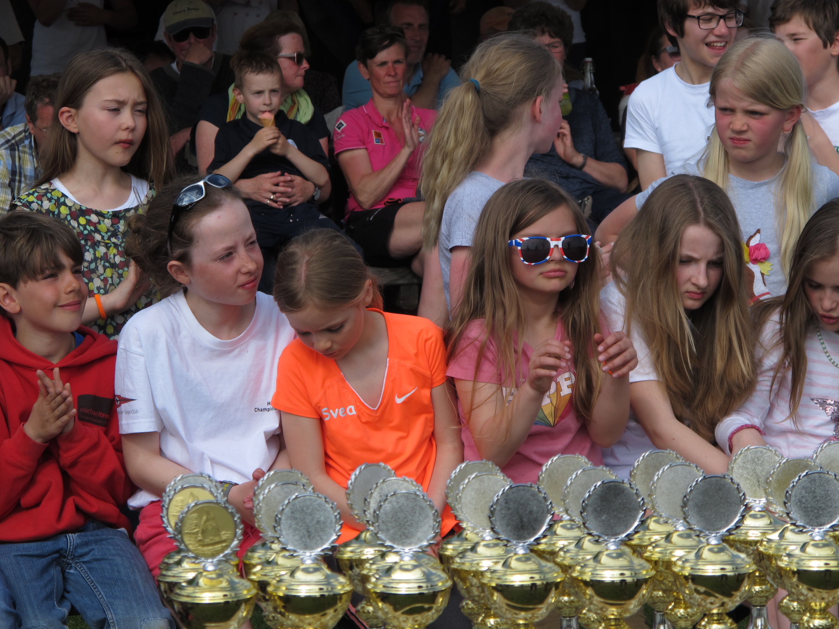 Der empfing alle Seglerinnen und Segel mit freundlichem Wetter und wieder leichten Winden, so dass nach Zeitplan um 10:00 Uhr gestartet werden konnte. Die mitgereisten Eltern hatten sich es auf der Oortkatener Tribünen bereits gemütlich gemacht. Schnell wurden zwei Wettfahrten gesegelt, dann dreht der Wind und die Regattaleitung hatte Schwierigkeiten, die Startlinie richtig auszulegen. Was auch dazu führte, dass die mitgereisten Fans an Land mehrfach umziehen mussten. Dank mehrerer Fehlstarts bei den A wurde es eng für die B, als die Uhr auf 14:30 Uhr zuging. Ein Fehlstart in B liess alle Hoffnung auf einen möglichen Streicher platzen, da nicht mehr innerhalb der ausgeschriebenen Zeit gestartet werden konnte.