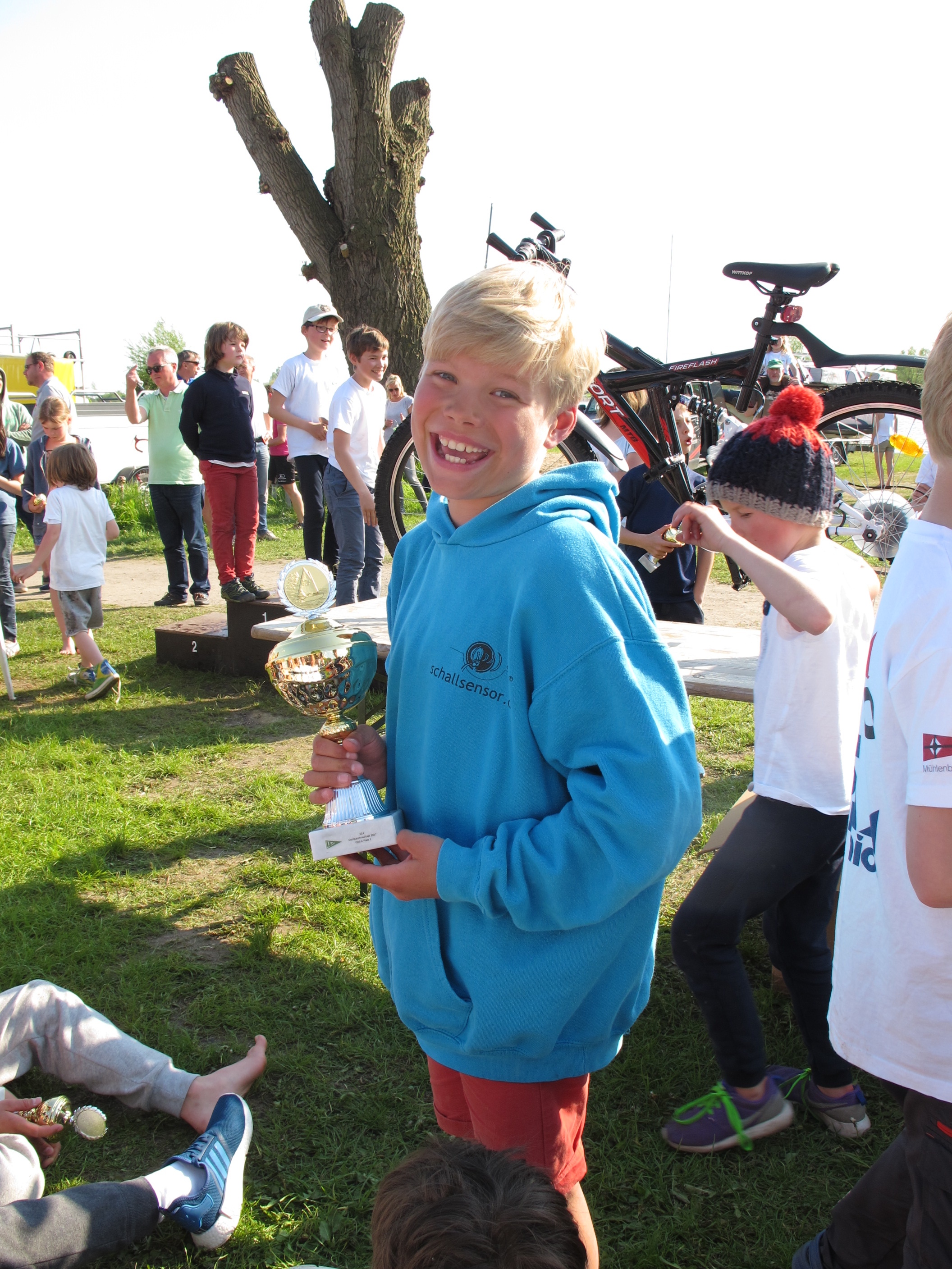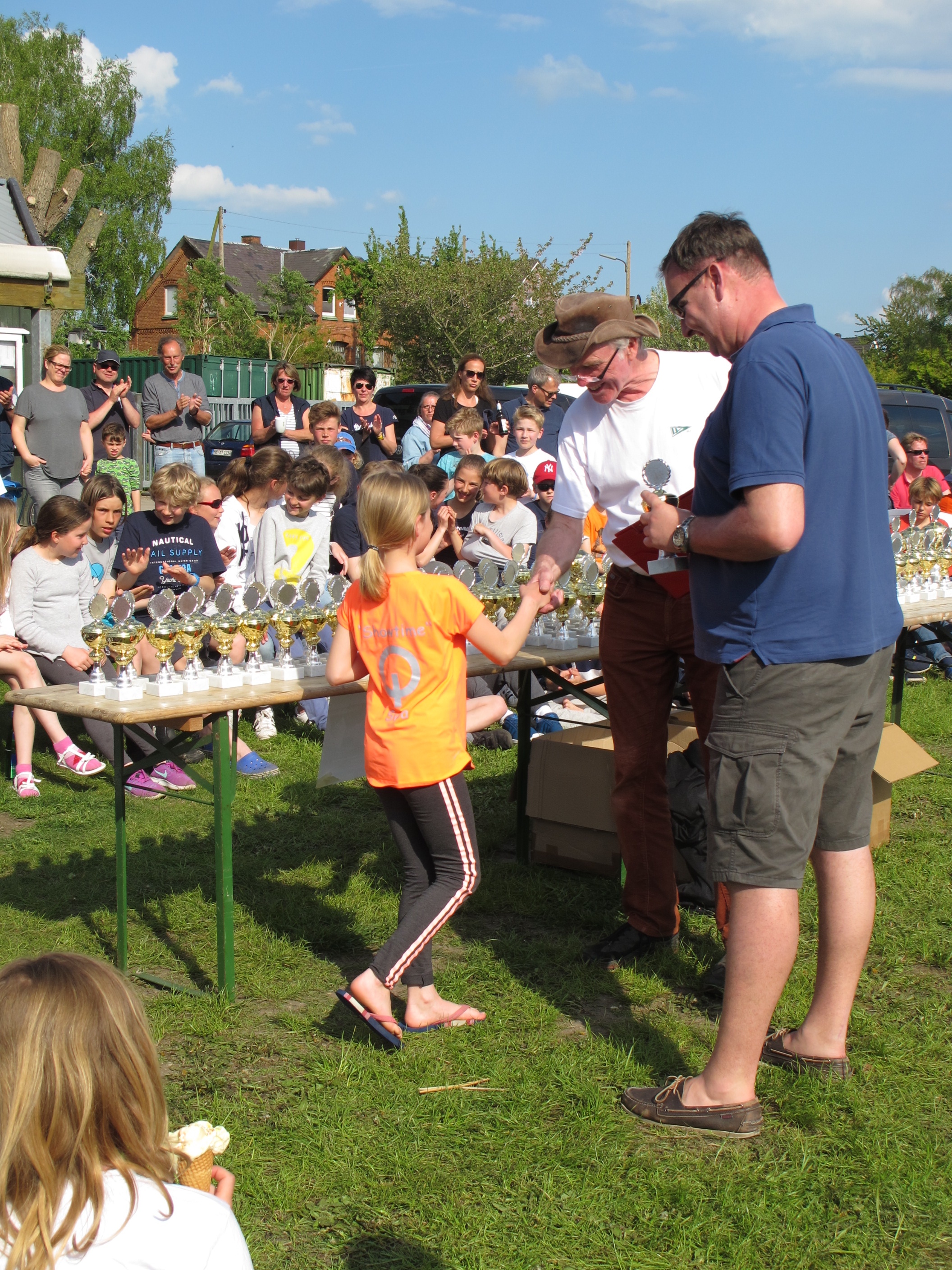 Während die A die letzte Runde drehten ging es für die B wieder in den Hafen. Dann das übliche Abbauen, Verladen, Grillen, Eis essen, Warten und Warten. Spannung vor der Siegerehrung. Heiner verkündete die Platzierungen, und wie in Oortkaten üblich, bekam wieder jeder einen Pokal. Während einige der B hinter ihren Möglichkeiten zurück blieben, konnte Bodo als jüngster Teilnehmer alle überraschen. In seiner zweiten B-Regatta schaffte er es gleich auf Platz 16 und damit in das erste Viertel. Bei 68 Booten gelang dies auch Janus (15ter), Leif (11ter) und Finn, der auf Platz 4 und damit knapp am Treppchen vorbei segelte.