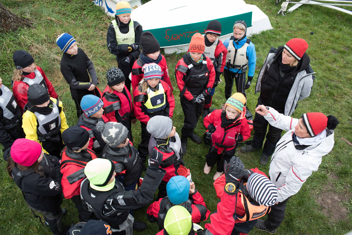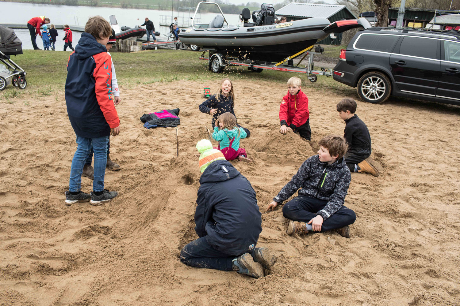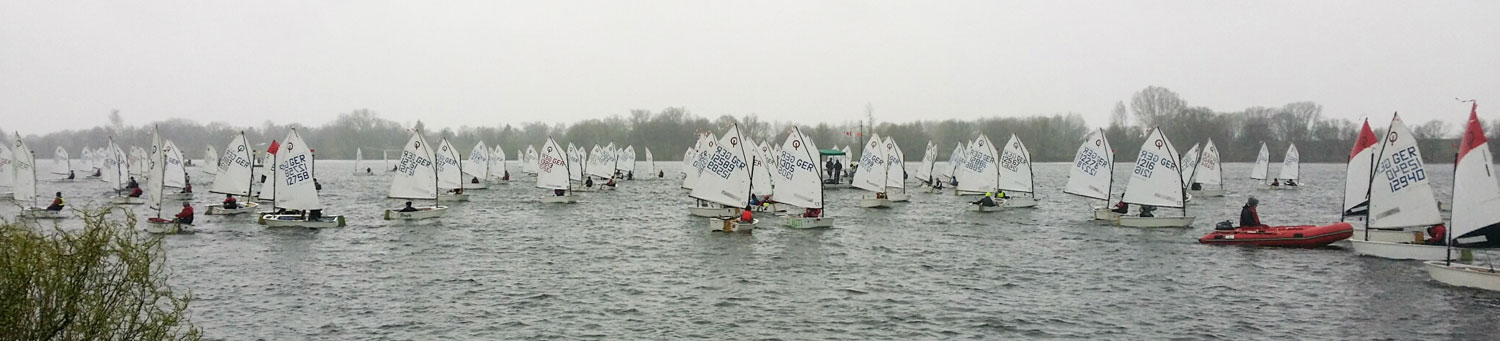 Der Vormittag verstrich und kein Wind war in Sicht, die ersten Eltern verloren die Nerven und packten ihre Boote ein. Kaum war dieses geschehen hellte sich der Himmel endlich etwas auf und mit der Stimmung kam zum Glück auch etwas Wind. Die Segler hatten es noch nie so eilig auf´s Wasser zu kommen! Viele konnten eine weitere Wettfahrt sehr gut gebrauchen um noch einen Streicher zu bekommen.