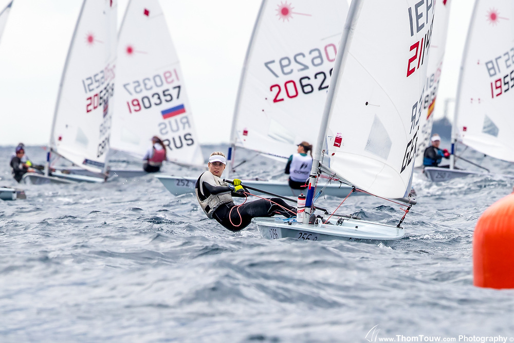 Am nächsten Tag ging es denn endlich los. Normalerweise segeln wir zwei Rennen pro Tag, da wir aber durch den Streiktag in Verzug waren, waren für diesen Tag drei Rennen angesetzt. Bei eher leichteren Winden schafften wir nur zwei Rennen, für ein drittes reichte der Wind nicht. Da wir 90 Teilnehmerinnen waren, wurden wir in zwei Gruppen eingeteilt. Für mich startete die Regatta hervorragend. Ich konnte das erste Rennen gewinnen, ließ damit sogar einige Olympiateilnehmer hinter mir. Die darauffolgenden Wettfahrten verliefen dagegen eher enttäuschend. Am zweiten Tag hatten wir deutlich mehr Wind, was leider nach wie vor nicht zu meinen Stärken gehört. Nach fünf Qualirennen verpasste ich das Goldfleet knapp und hatte somit in den letzten drei Tagen keine Möglichkeiten, mich noch weiter nach vorne zu segeln. Ziemlich enttäuscht startete ich dann in die ersten Rennen im Silberfleet. Dort schaffte ich dann immerhin einige gute Einzelplatzierungen und konnte auch das letzte Rennen nochmal gewinnen. Insgesamt reichte es nur für einen 52. Platz.