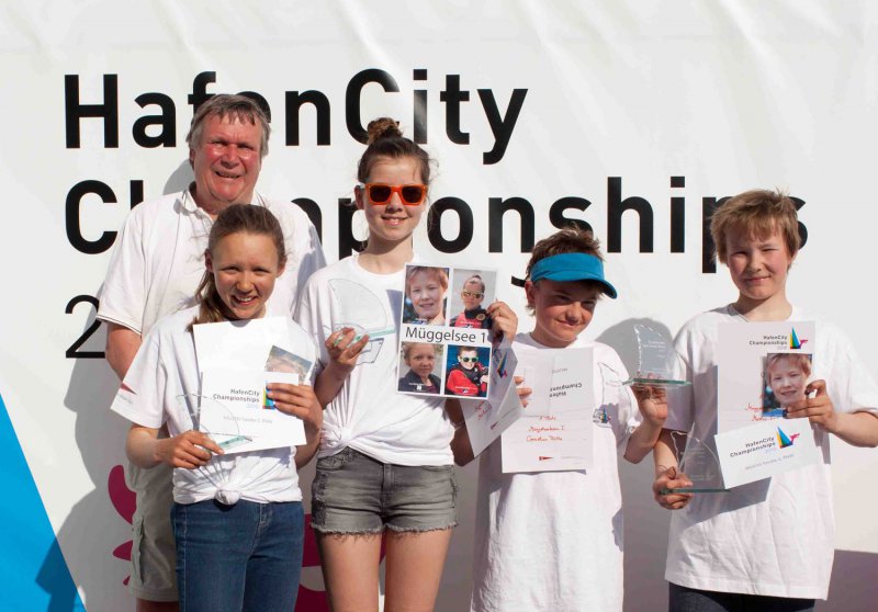 Alle Zeichen sprechen für eine Wiederholung beim nächsten Hafengeburtstag im nächsten Jahr! Dann können MSC-, SC4-, SVAOe-, BSC- und SCU-Kinder gegen noch mehr Konkurrenz aus anderen Bundesländern segeln. Der Veranstalter freut sich auf die Anmeldungen aus Hamburg, Deutschland und der Welt, um die Hamburger Teamrace Meisterschaften bei idealen Wettbewerbsbedingungen mit großer Zuschauerbeteiligung auszutragen. Bei der Siegerehrung gab es durchweg glückliche Gesichter angesichts der Urkunden, Süßigkeiten, Pokalen und den sportlichen MUSTO-Taschen in unterschiedlichen Größen. Nach der flotten Siegerehrung lud die Cheforganisatorin Grit Müller zum Imbiss ein. Für alle Helfer/-innen der vergangenen vier Tage gab es noch eine Currywurst und Crêpes sowie entsprechende Getränke und einen Optimisten-freien Blick auf den Grasbrook-Hafen. Schön war‘s!