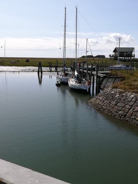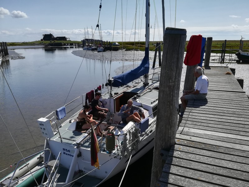 Im Seglerhafen der Hallig Hooge kreuzten sich am 21.08. 2018 die Kurse von „Döntje„ (Klaas Schlenkermann und Crew) und von „Fliegender Stern“ (Klaus Lange und Ulrike Gebauer), siehe Foto.