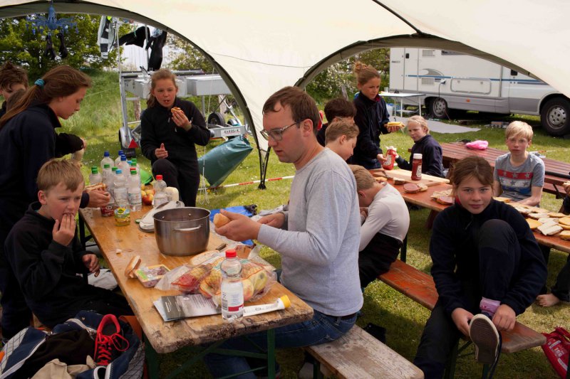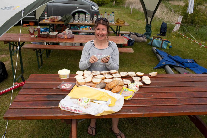 Das Unterstützerteam an Land war große Klasse. Zu Anfangs in kleiner Besetzung zeigten Moni, Conny, Thomas und Max, wie man so einen Haufen ambitionierter Segler/-innen versorgt, motiviert, tröstet und auch ein bisschen zur Disziplin ruft. Unterstützt wurden sie dann im Laufe der Woche von Regine und Nikki. Untergebracht war die Gruppe in einer charmanten Anlage mit überdachten Schlafsälen unweit vom Hafen Schilksee entfernt. Der Transfer erfolgte im MSC Bus. Zentraler Anlaufpunkt war jedoch der Zeltplatz hinter dem westlichsten Hafenbecken. Dort hatte der MSC sein Versammlungszelt aufgebaut, wo die Vor- und Nachbesprechungen durchgeführt wurden, eine Erstversorgung nach dem Training mit Melonen, Bananen, Frikadellen und auch Süßigkeiten stattfand, wo sich die Segler umziehen konnten und in großen Sammelaktionen ihre Kleidungsstücke suchen und wieder einpacken durften.