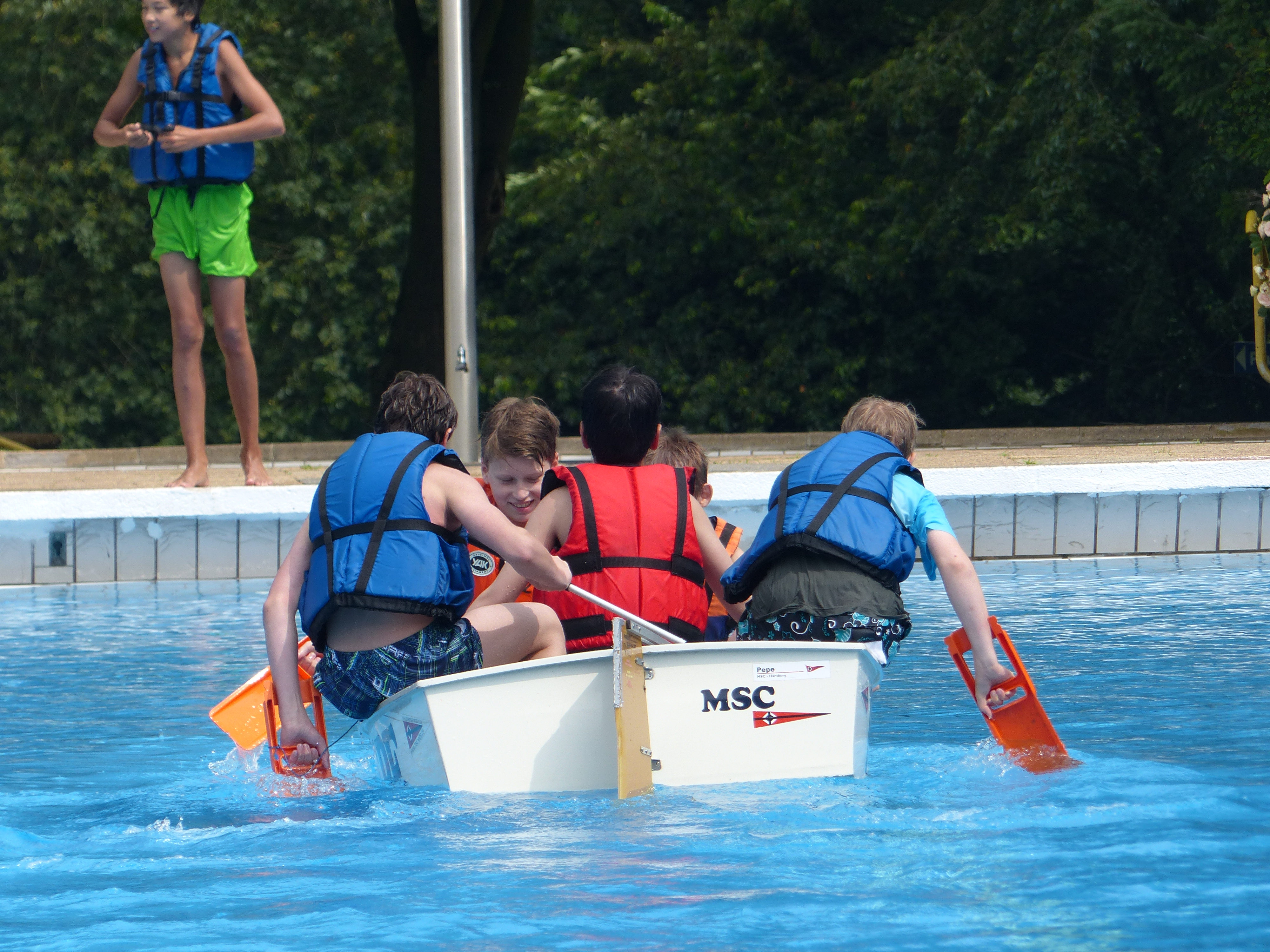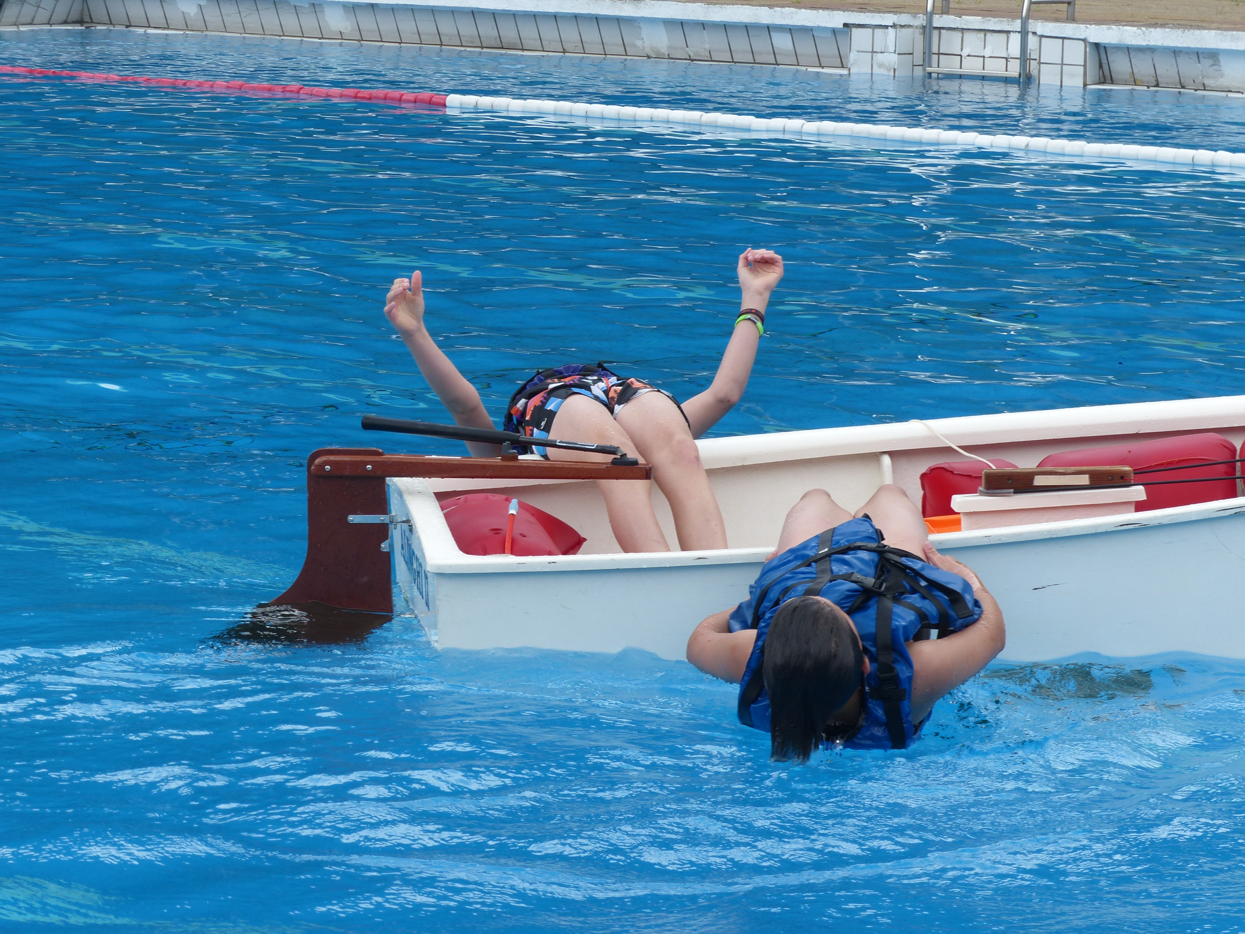 Bei strahlendem Sonnenschein und kristallklarem Wasser durfte jeder einmal absichtlich im Springerbecken kentern – und lernen, das umgeschlagene Boot wieder aufzurichten. Gar nicht so leicht, dann auch noch hinein zu klettern und das ganze Wasser wieder auszuschöpfen.