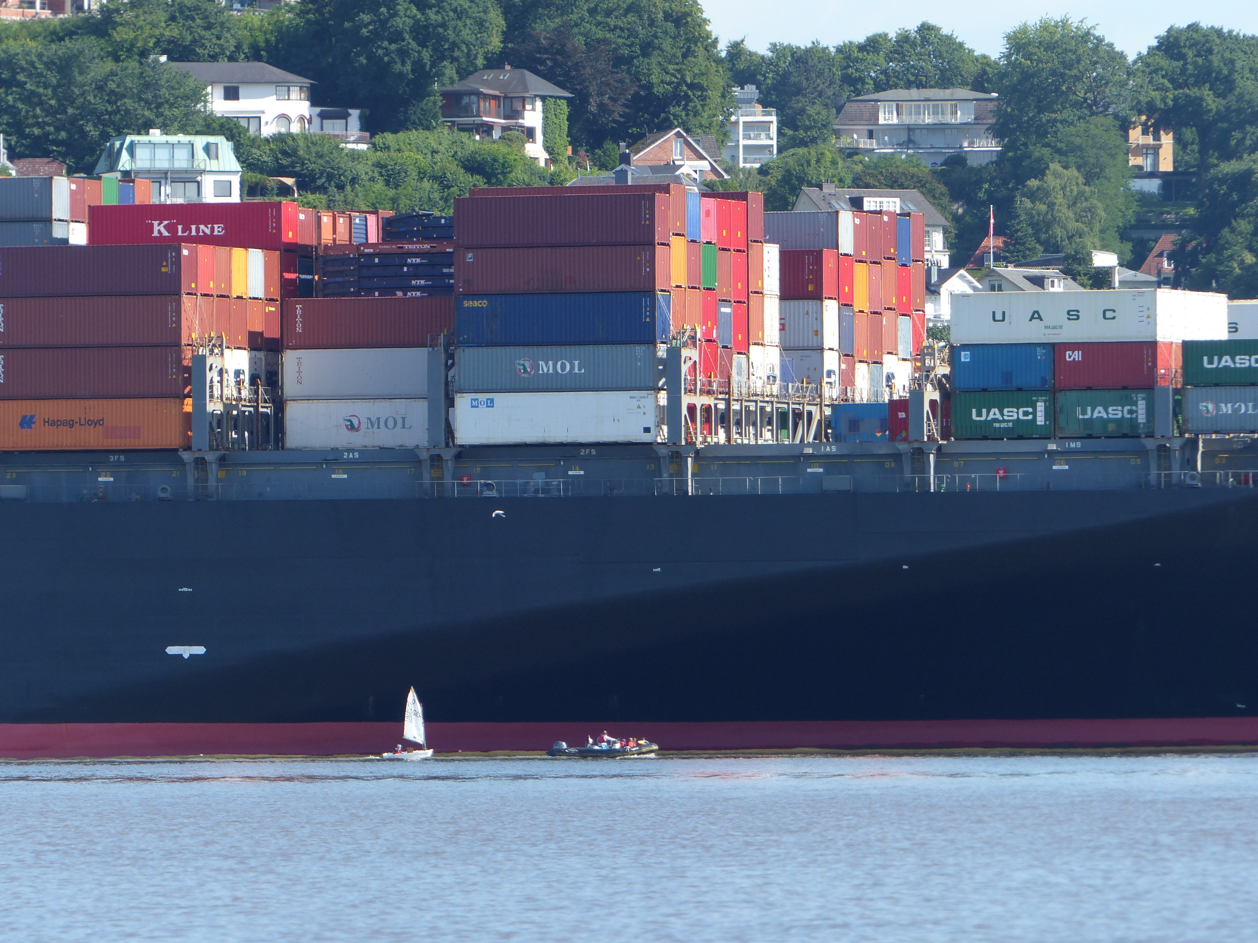 Der Freitag lockte wieder mit strahlendem Sonnenschein und so nahmen wir vier Optis hinter den Motorbooten ins Schlepp und fuhren rüber ins Mühlenberger Loch, wo wir unser Strandlager auf Schweinesand aufschlugen und die ganz Mutigen die freie Fahrt auf der riesigen Wasserfläche ausprobierten.