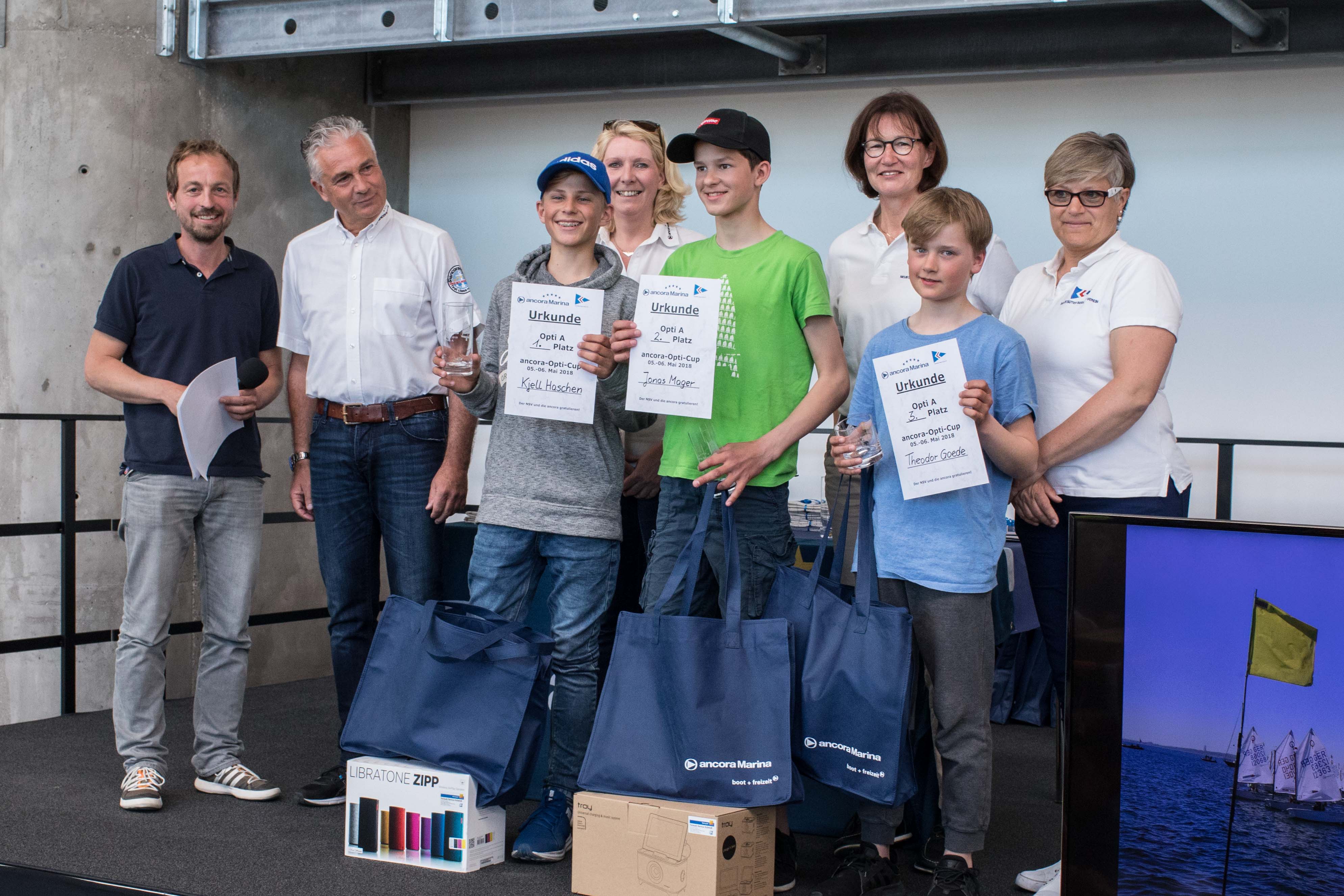 Das liegt eben an dem tollen Renommee des Neustädter Segel-Vereins, der die ganze örtliche Wirtschaft zum Sponsoring des ancora Opti-Cups animieren konnte. Jedes Kind erhielt eine schöne Tasche, gut gefüllt mit den mehr oder weniger nützlichen Utensilien wie Schlüsselanhänger, Trinkflaschen, Etui mit Plastern, Tassen, Kugelschreiber und Sonnenbrillen. Der MSC war trotz Alternativveranstaltung auf der Alster mit acht A-Seglern und zwanzig B-Seglern angerückt, da die Ferienwoche zum Segeltraining in Neustadt genutzt wird. Auf dem Siegertreppchen standen sowohl bei A und B MSC-Segler/innen.
