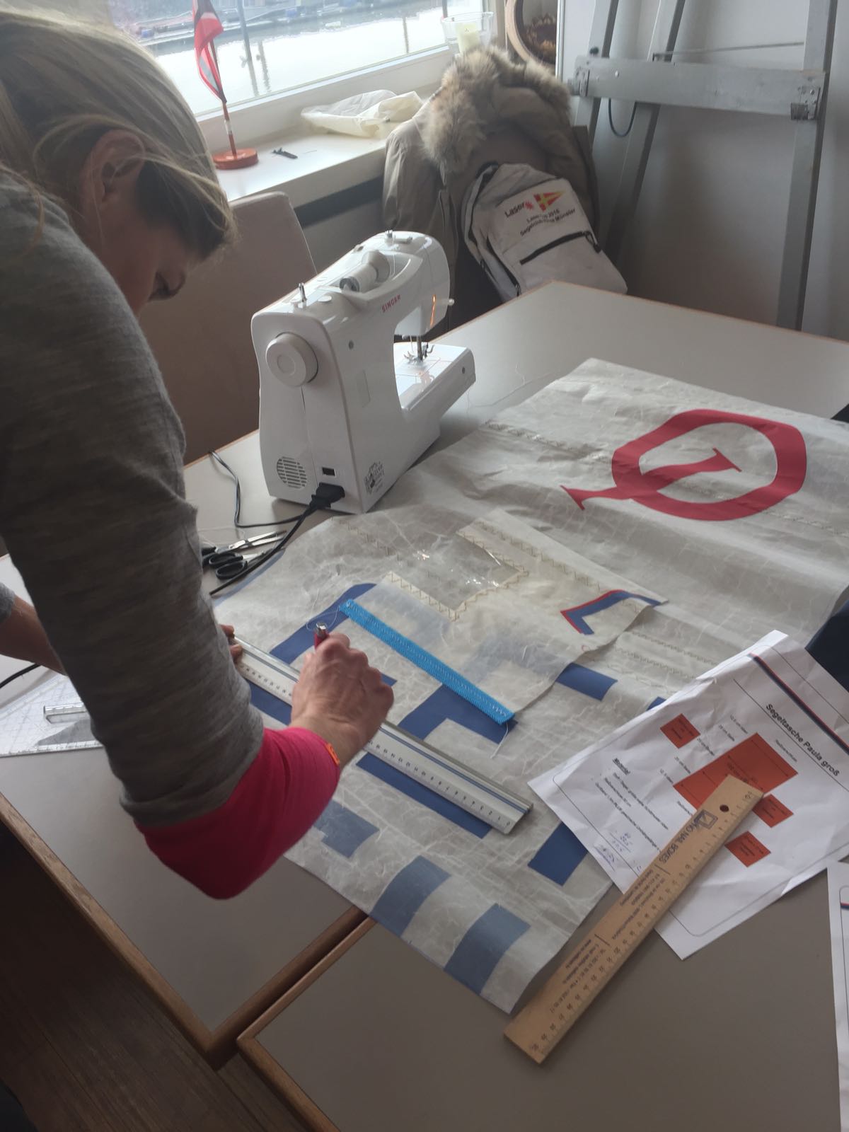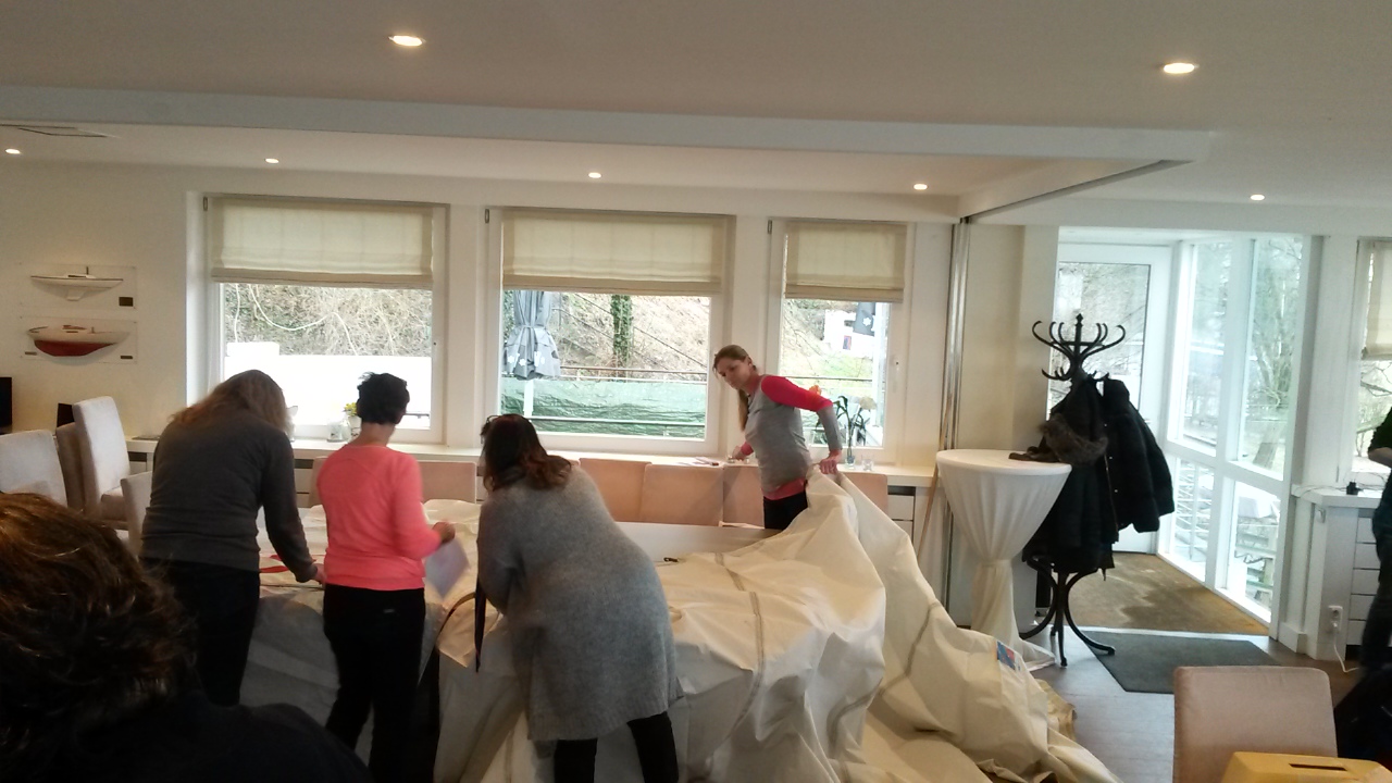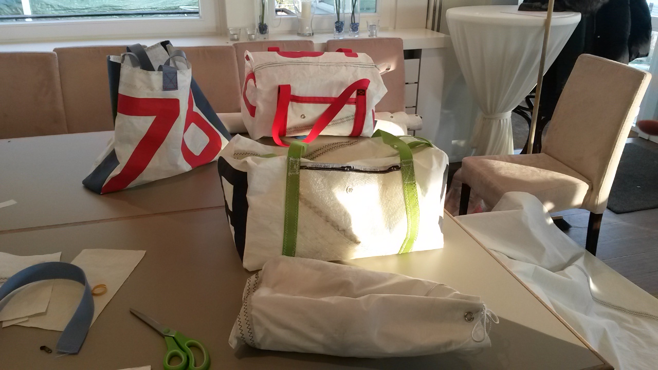 Nachdem Marion ihre vorbereiteten Taschen präsentiert hat, konnten sich die Näheifrigen aussuchen, was sie nähen wollten. Die jeweiligen Schnitte dafür hatte sie auch parat. Das war mitunter der schwerste Teil des Workshops. „Welche Tasche soll ich nähen?“, „Aus welchem Stück des Segels?““Darf ich das auch nehmen?“ „Das wollte ich haben!“, „Wo ist die Schere?“ Ein teilweise wahnsinnig scheinendes Gewusel um den Schneidetisch entbrannte. Segel ausbreiten, drehen, gucken, messen, anzeichnen, radieren, neu anzeichnen, schneiden. Das Club-Haus schien fast zu klein zu sein, um als Nähwerkstatt genutzt zu werden.